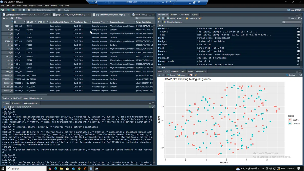 発現解析。 (2022年頃のR Studioバージョンでbioconductorまわりが動作不良起こしたのでRDPでhyper-v仮想マシンに最新のr/rStudio/rTools入れ直してやっている)