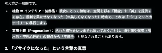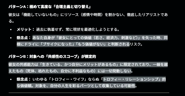彼女の本質、本性というより『習慣/価値観』的なものかをダブルチェックしたくて、geminiに今少し訊いていた。