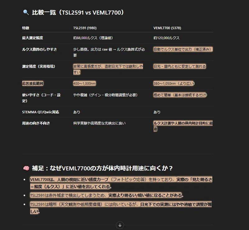 ・VEML7700は、人間の視覚に近い感度カーブ(フォトピック応答)を持っており、実際の「見た明るさ=照度(ルクス)」に近い値を出してくれる