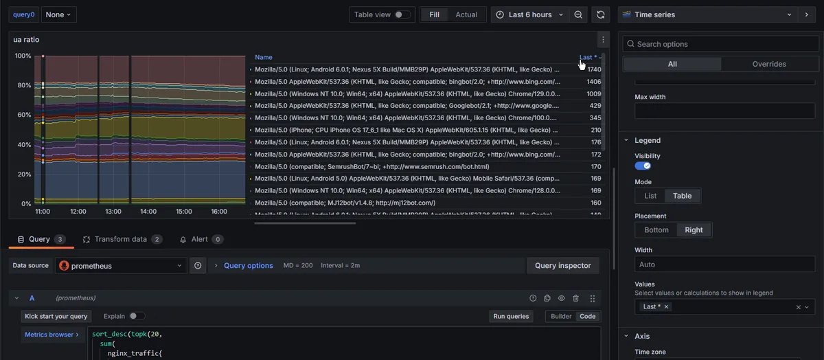 これが、legendでの並び替えができないものだと思ってて色々調べたり、でprometheusのsort_by_labelはgrafana側での実装がまだだのflagが必要だのflag付けても(エラーは出なくなったけど)動かないし、で結局topk使って出力数制限掛けるしかないのか…とやってたけど、これでソートもできるなら"ここはgaに軍配だな…"の部分が一つ解消される。