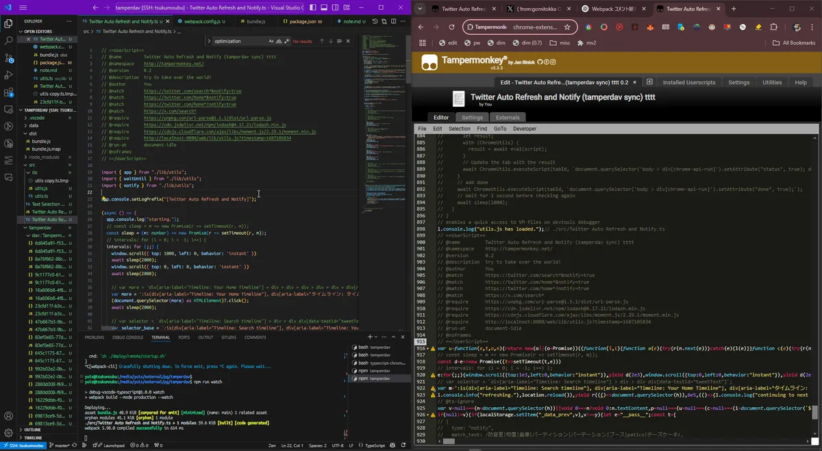 ユーザスクリプトがvscode+typescript+copilot+webpack環境で書けるのは助かるわ。保守も楽になりそうだし、金取るにしてもwebpackで難読化/電子透かし/コメント処理とかも楽になる。