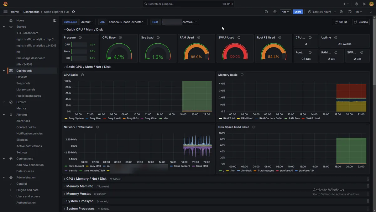 grafana。prometheus/node_exporterとNode Exporter Fullダッシュボードを組み合わせ。